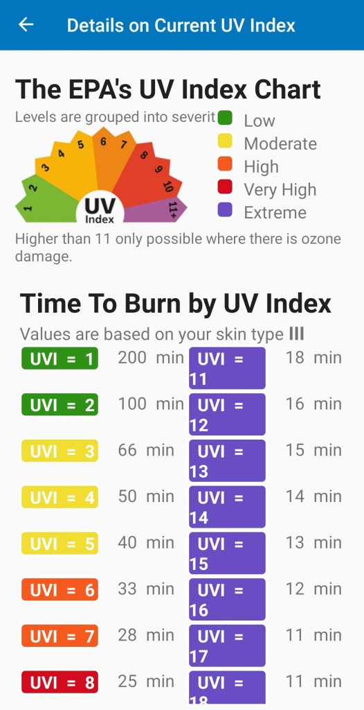 Y aquí es donde la cosa empieza a ponerse interesante: si pulsamos sobre el UVI podemos ver el tiempo a partir del cual tendríamos quemaduras en función del UVI y nuestro tipo de piel.