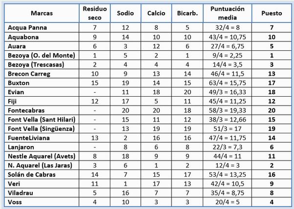 Si quieres saber cuáles son las peores marcas de agua, aquí tienes una tabla que he encontrado por la red. Las peores son las que están más altas en el ránking de la última columna (1: agua de planchado 20: medianamente bebible)