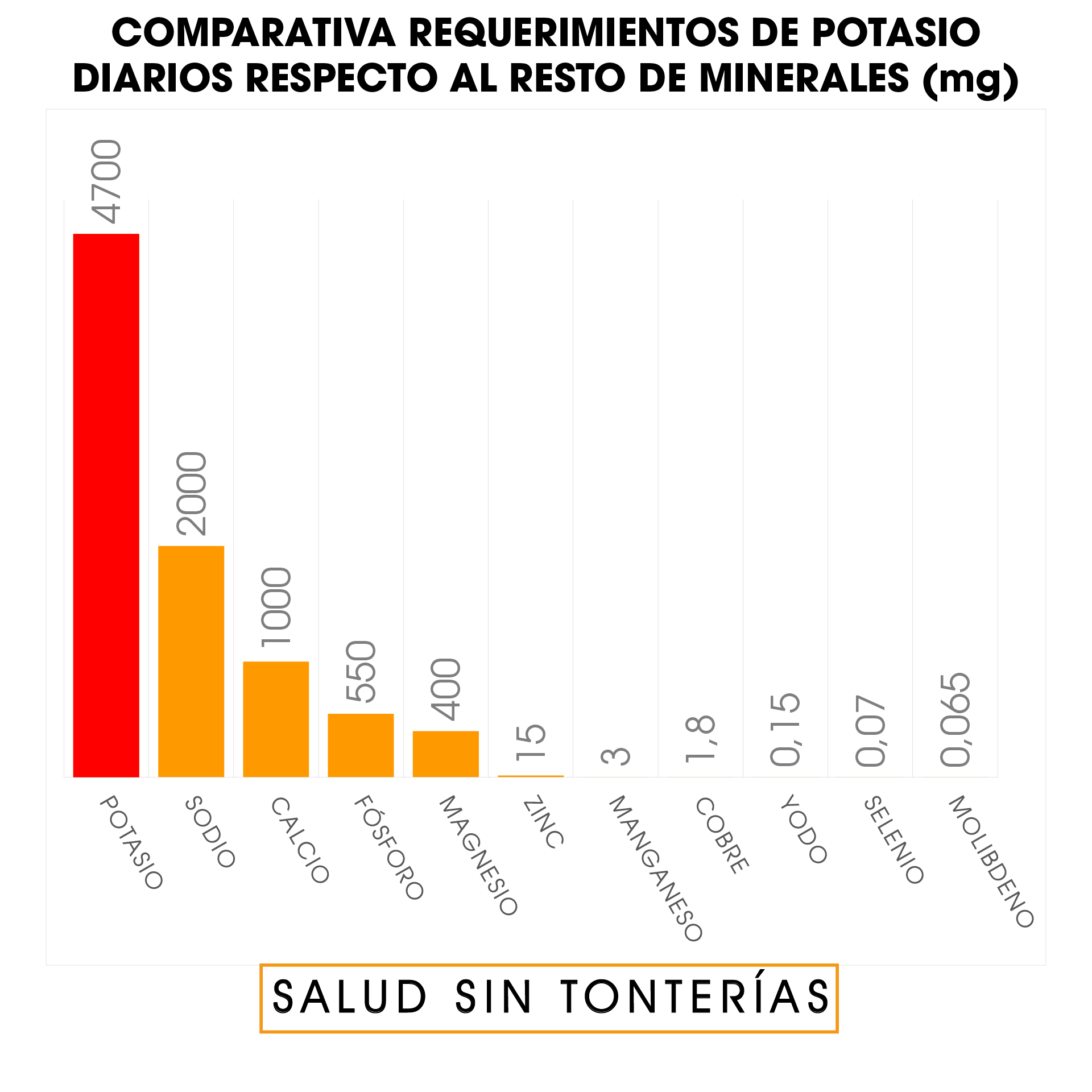 Esta cifra de 4700mg tal vez no te diga nada, pero si lo comparamos con el resto de minerales, las diferencias son abismales: