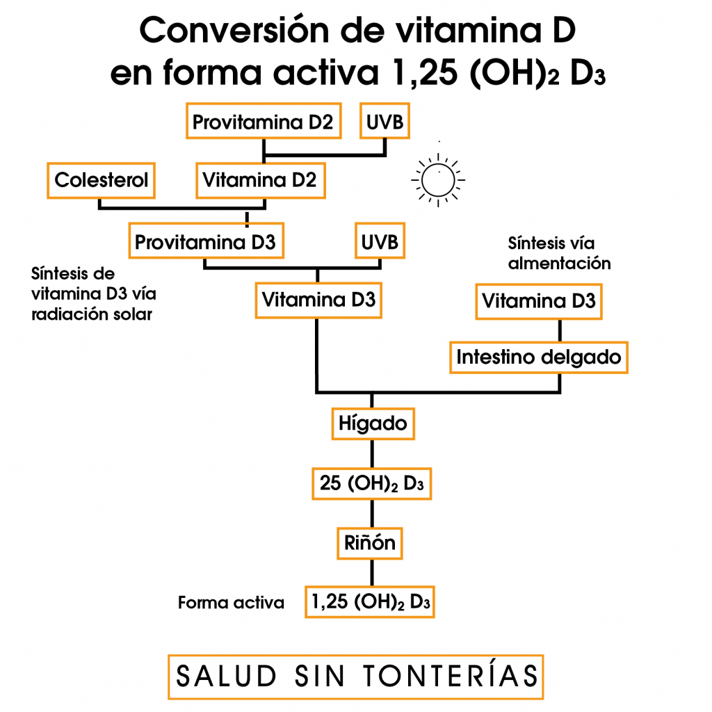 Pero, ¿qué mierda me estás contando de que la vitamina D no hace nada en el cuerpo? Pues sí. La vitamina D3 en su forma colecalciferol no tiene actividad biológica en el cuerpo y debe convertirse a 1,25 dihidroxicolecalciferol o calcitriol que es la forma activa.